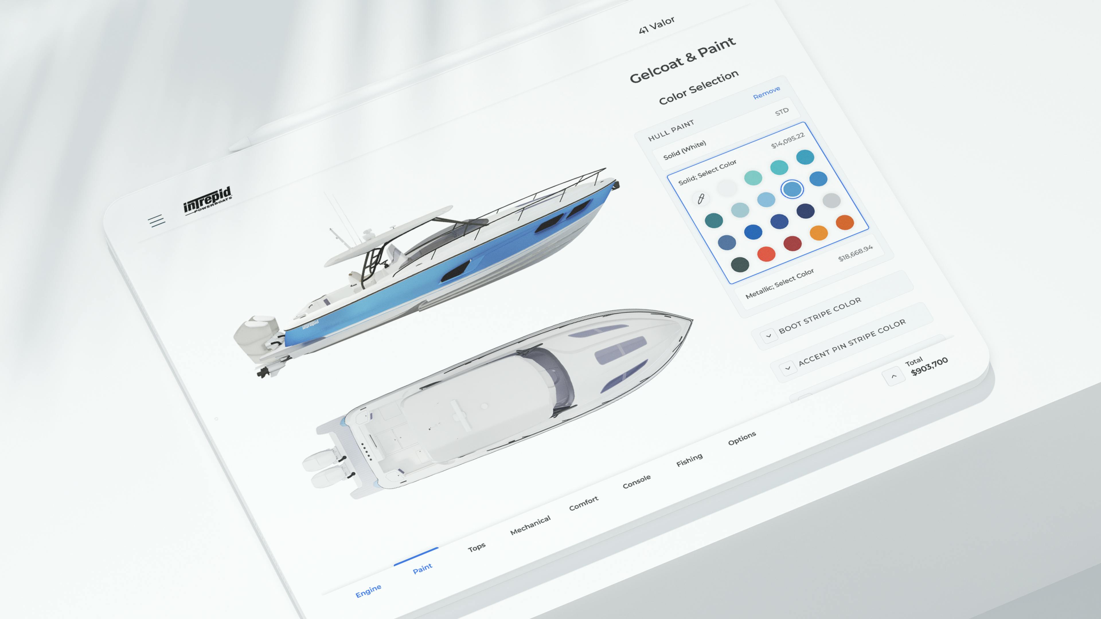 From iconic center consoles to luxurious sport yachts, Intrepid Powerboats is known for building fast, sleek, and obsessively crafted vessels. They occupy a space few boat brands can claim: high-end performance with a highly tailored experience. We were tapped by MarineMax to reimagine the boat configuration experience and to establish a flexible design foundation—one that could not only power Intrepid’s experience, but also scale across future tools in their portfolio.